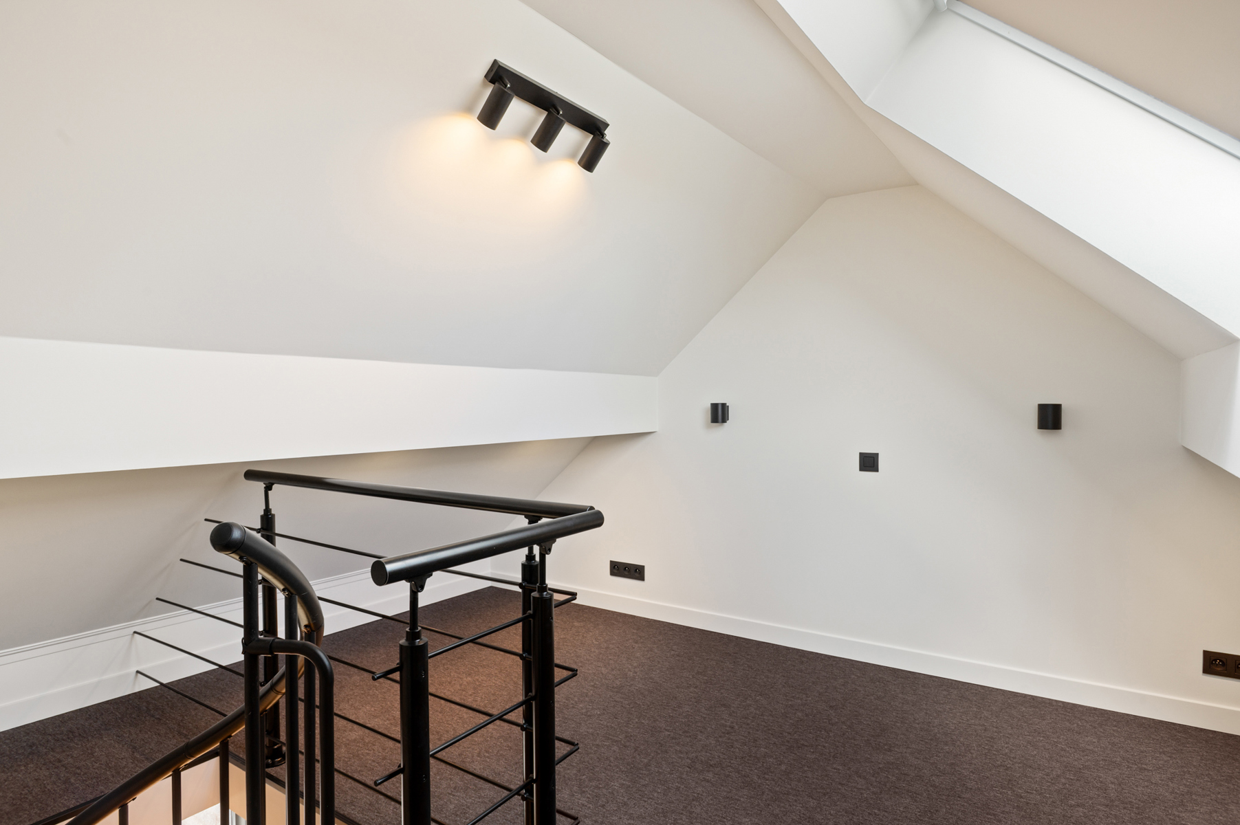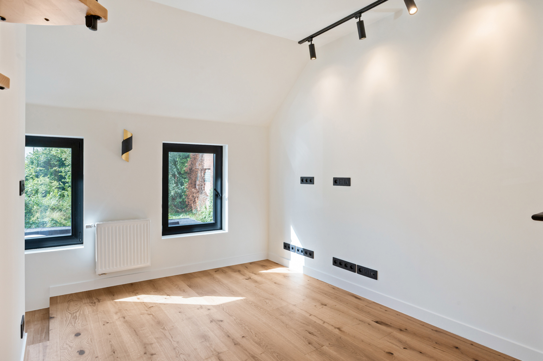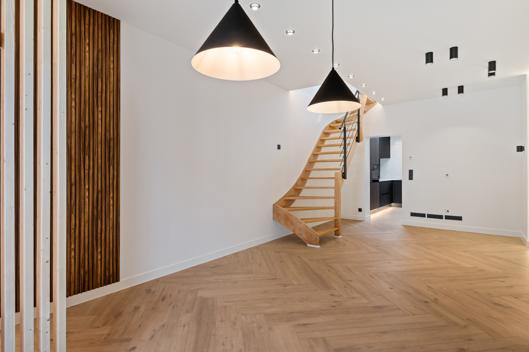 Je komt binnen in de riante leefruimte die werd voorzien van een prachtige visgraatvloer met aangrenzend de moderne keuken die geniet van een prachtig design met warme houttinten en stijlvolle muurtegels. Verder heb je hier een prachtige badkamer met een ruime inloopdouche, lavabo in meubel en handdoekradiator en toilet – dit alles met een zorgvuldige afwerking en mooie, zwarte accenten. Op de eerste verdieping bevinden zich 2 slaapkamers van maar liefst 11 m² & 6,8 m², de draaitrap leidt je vervolgens naar een polyvalente ruimte van 17 m² die je perfect kan benutten als 3de slaapkamer, werkruimte of kamer voor jouw geliefde hobby’s!