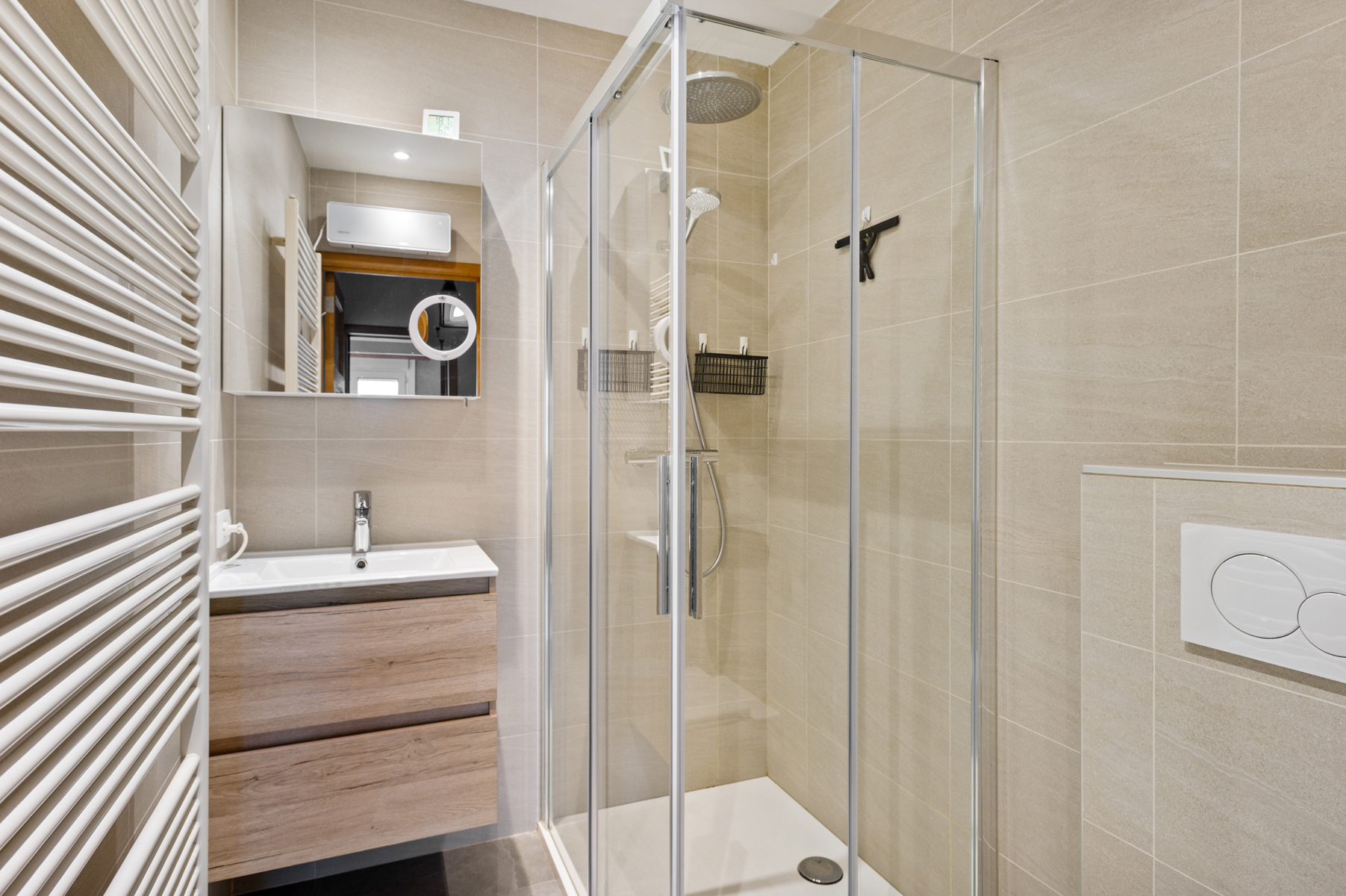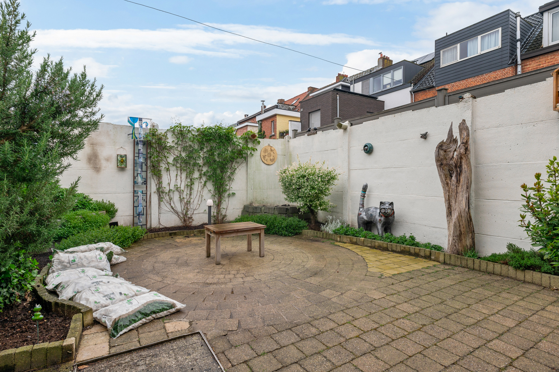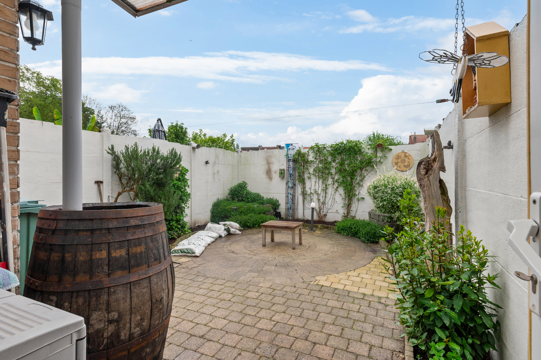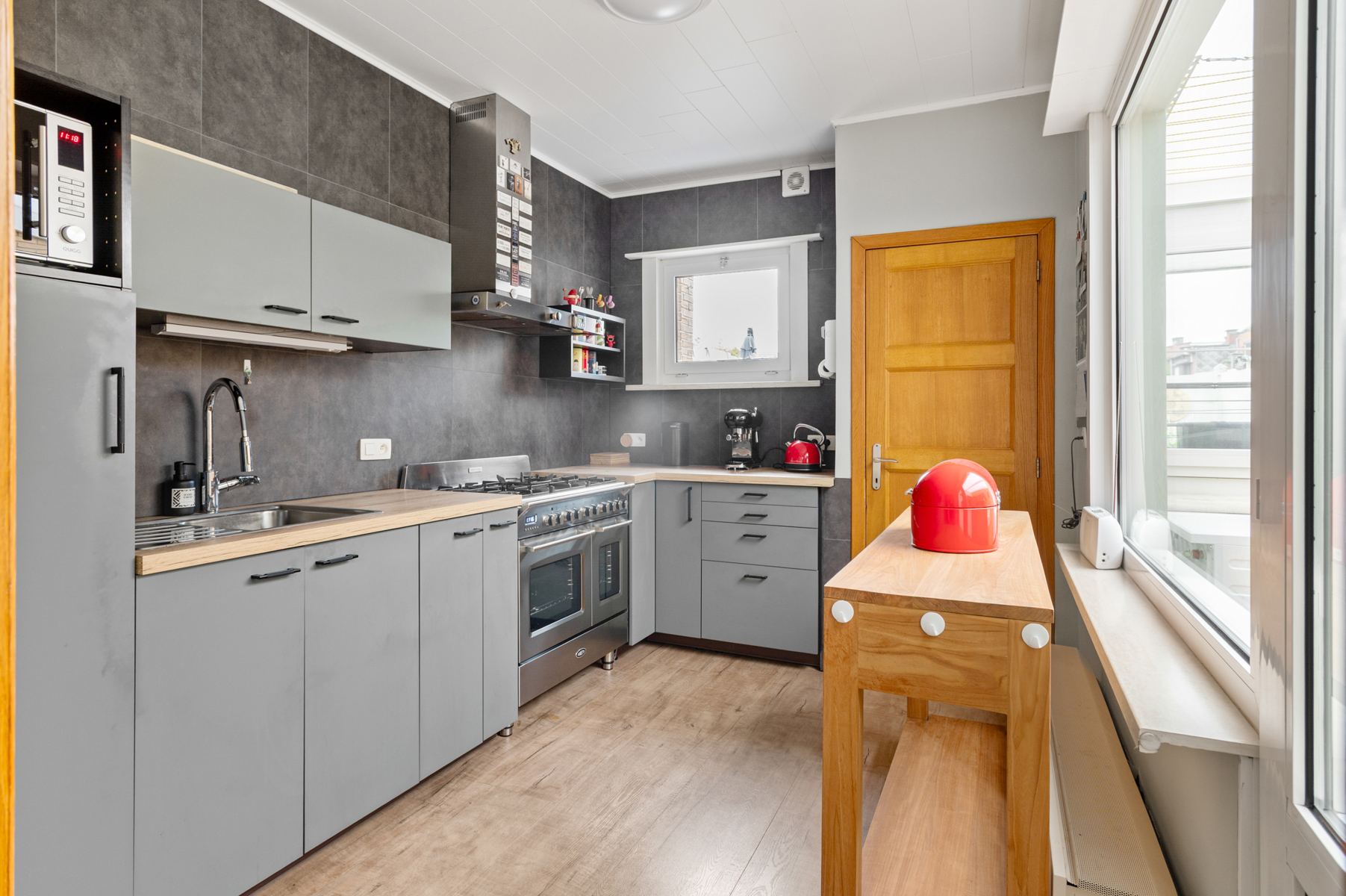 Via de inkomhal betreedt je de L-vormige leefruimte welke geniet van een overvloed aan natuurlijk daglicht dankzij de grote raampartijen. Aansluitend tref je de functionele keuken aan – volledig uitgerust voor het moderne kookcomfort met onder andere 5-pits gasfornuis, 2 ovens, een inox spoelbak, ingebouwde koelkast, etc. Bovendien stap je vanuit deze ruimte in het uiterst gezellig stadstuintje (ZW gericht) van maar liefst 36 m² waar men in alle rust en privacy kan ontsnappen aan de drukte van de dag. De eerste verdieping biedt 2 ruime slaapkamers (18,40 m² & 12,80 m²) en een trendy badkamer uitgerust met een douche, lavabomeubel, toilet en een praktische handdoekradiator.
